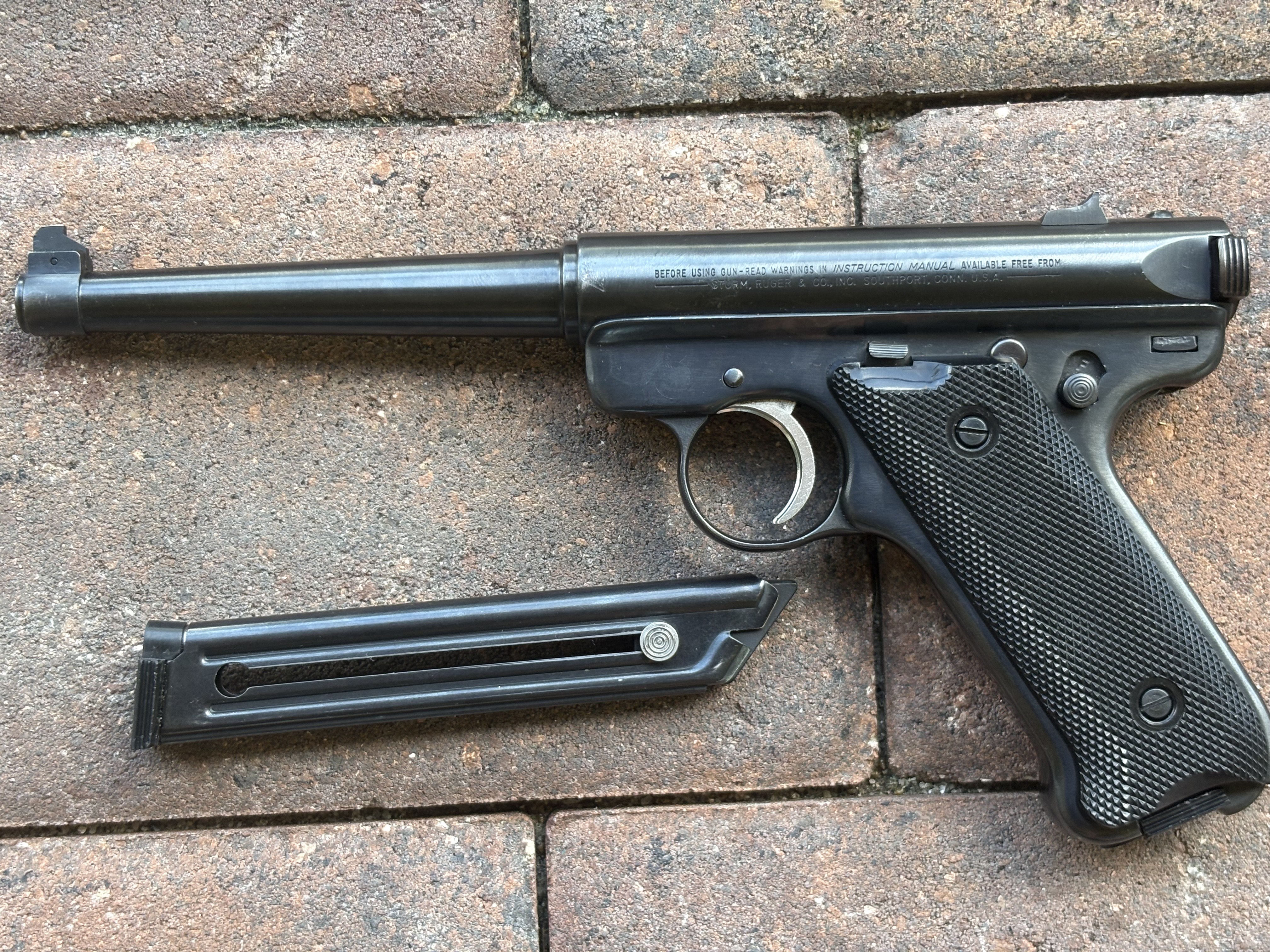 Ruger mark II.22 cal semi-automatic blue steel finish manufactured in 1988 with 4.75 inch barrel with Ruger medallions and fixed sights. Comes with two 10 rd magazines. NRA Condition- Excellent serial number 213-58891. No trades, must pick-up in the greater Sarasota area.